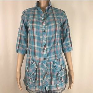 BEN~LEX Blue Pink Plaid Button Up Tunic Semi-Sheer