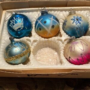 6 Vtg Lanissa Glass Christmas Ornaments Gold, Box, 3"