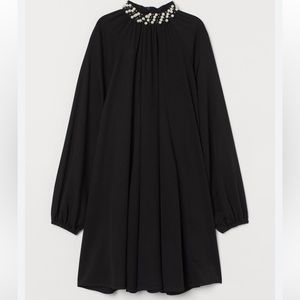 H&M Black Holiday Long Sleeve Smock Dress with Pearl Beaded Neckline NEW!