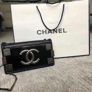 Chanel brick boy bag used purse black lamb skin