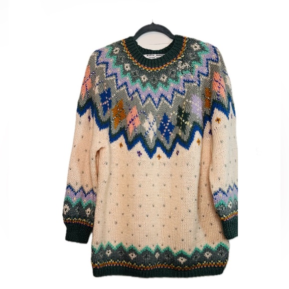 The sweater is just gorgeous. The sequins look as if some sparkling snow fell on the shoulders. Great find. Thanks.