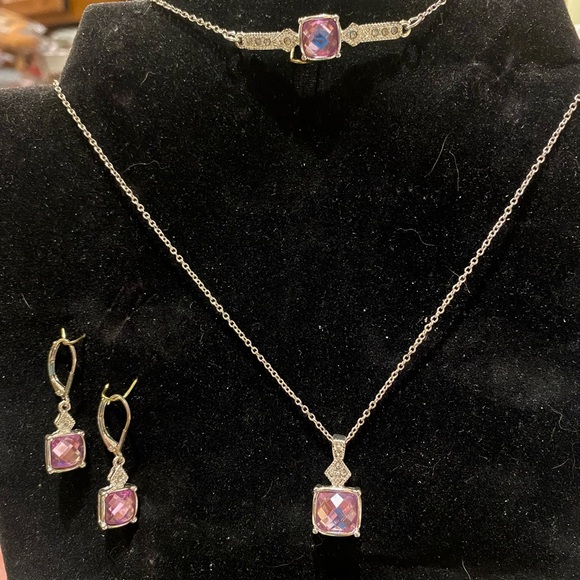 Lovely faux silver-tone and pink gemstone necklace, bracelet and earrings set.