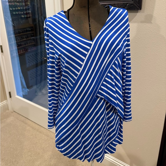 I thought the trim on the black wrap style top was black and silver from the photo but it turns out that it was black and coppery. Which made me even happier because it is a perfect match for my rust colored Choco's Traveler pants and jacket. It also fits me perfectly. The blue top fits great as well and the diagonal stripes on the front are so flattering. I'm very happy with my purchase.