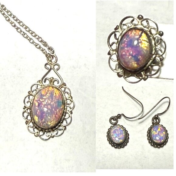 Exquisite vintage Czech Glass Harlequin Opal necklace and 2 pairs of earrings.