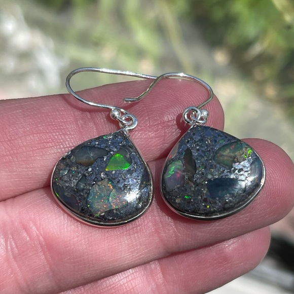 Earth Art hand crafted artisan Jewelry - Genuine Ethiopian opal in pyrite silver earrings with Garnet or Peridot