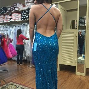 Blue backless beaded gown.