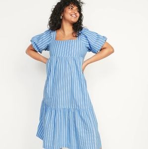 Fit & Flare Puff-Sleeve Cotton-Poplin Smocked All-Day Midi Dress