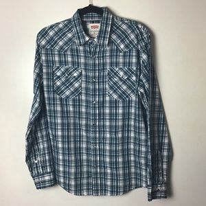 Lucky Brand blue/green plaid long sleeve pearl snap shirt. XXL