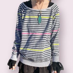 Vintage Rainbow Sparkly Semi Mesh Striped V-Neck Short Sleeve Top Large