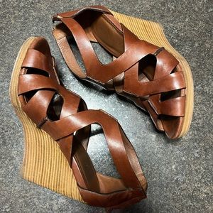Guess Wedge High Heel Strappy Cage Gladiator Tan Brown Platform Gold Buckle 8.5