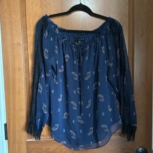 Navy blue blouse, sheer sleeves with black lace accent, body is lined
