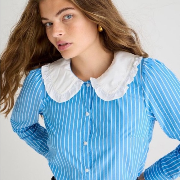 J. Crew Tops - NWT J. Crew Organic Cotton Ruffle-Collar Poplin Shirt in Blue White Stripes