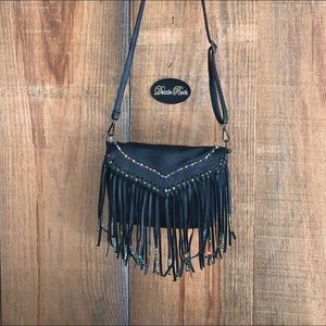 Jeweled crossbody purse with fringe.