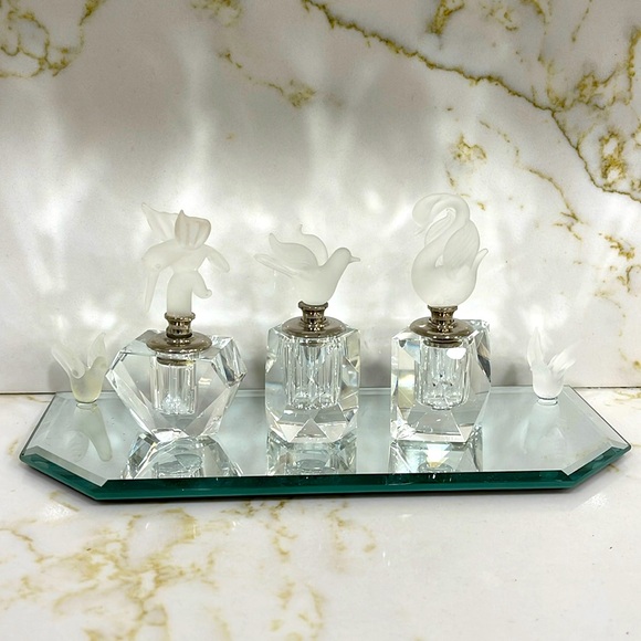 I am absolutely thrilled with this purchase! The mirror, the beautiful glass bottles, the delicate bird stoppers, all of it together make a truly stunning display. The items were accurately described and pictured online. Each delicate little piece was packaged with the utmost care and everything arrived in pristine condition. Thank you for an outstanding order! 🥰🥰🥰. I would buy from this seller again anytime!