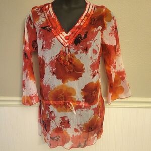Sahiba Sheer Dress Vintage Red Beaded Orange Floral India Coverup Tunic M