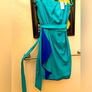 Strapless Express turquoise dress with side zipper. Wrap around tie. Size 10