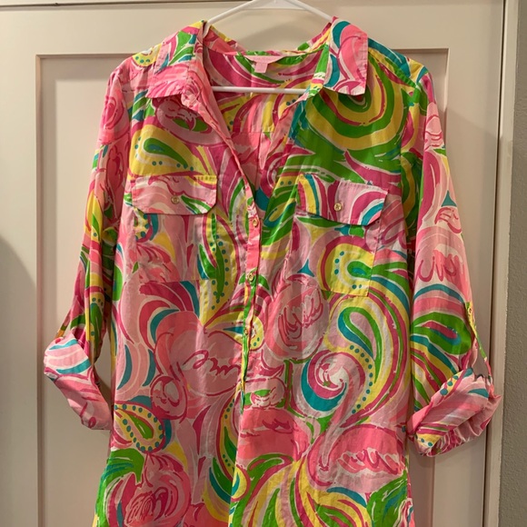 I am sorry, I thought I have already done the review. I really love this shirt. A little tight but I will get to it. Beautiful condition. Thank you so much!