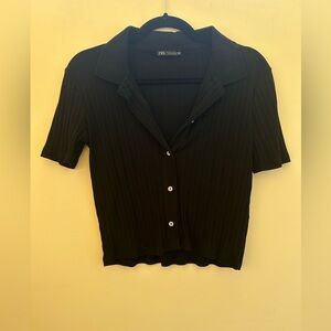 Zara short sleeved cropped button down knit in ribbed black. Size M