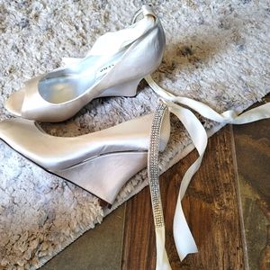 Nina size 7M satin white, wedge with rhinestone ties wedge open toe shoes