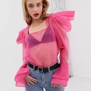 ASOS DESIGN long sleeve organza blouse with puff sleeves in neon