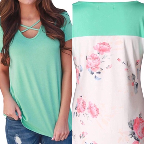 fleasee Tops - Rear Floral Printed Criss Cross V-Neck T-Shirt