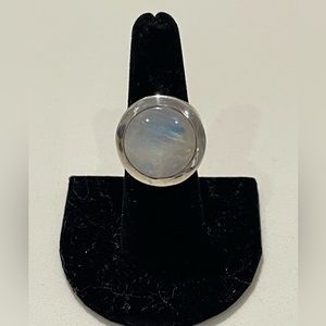 Gorgeous moonstone ring with blue and whitish shimmer. Made in silver. Size 8.