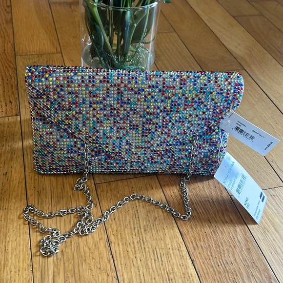 So pretty! Multi-colored stones make the bag useable with several different colored outfits, dresses, and gowns. It’s dressy, but can still be used with more casual outfits. It has a nice length metal strap that is removable, or can be tucked in the bag. New with tags as stated. Arrived quickly and safely. Thanks so much!