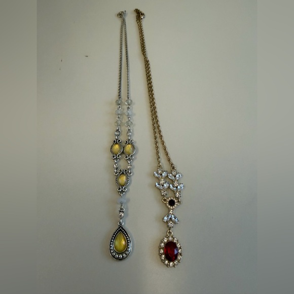 Beautiful Avon lavaliere necklaces. One is silver-tone with faux yellow gemstones, and the other is gold-tone with with faux rubies and rhinestones.