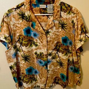 Extra large (16/18) button up blouse on beiges, blues & black