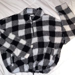 Pink Rose Buffalo plaid, half zip, pullover fleece with drawstring waist. Medium