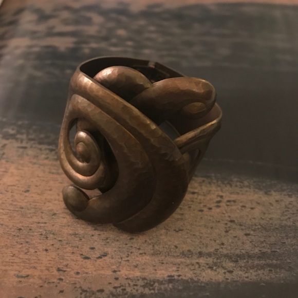 This is such an interesting swirled clamper cuff. I think its copper instead of bronze, but I'm not sure. It's a unique pattern that has overlapping sides and is comfortable on the wrist. Thanks so much for a great price too! Best, Dixie