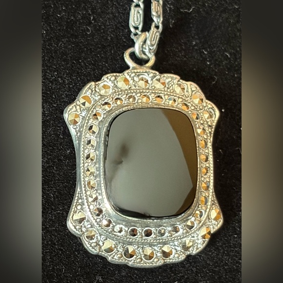 Exquisite vintage Black Oynx and Marcasite sterling silver pendant necklace. Gorgeous!