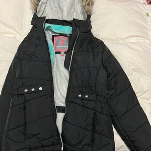 Size 10-12 girls black coat with teal lining. From free country. Warm and fuzzy