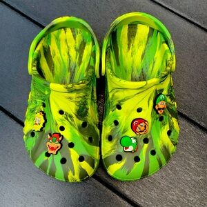 Marble Crocs with Super Mario Jibbitz, Kids size 2