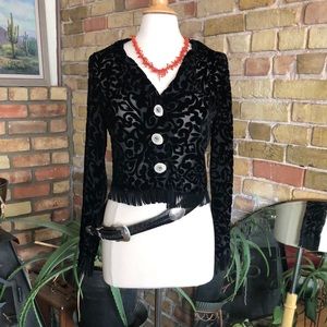 Vintage Vamp cowgirl black velvet shirt with fringe and deer antler buttons.
