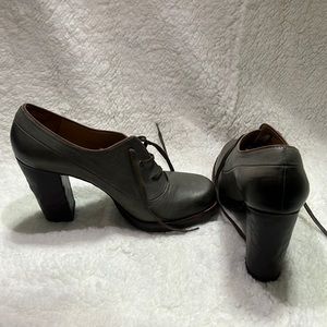 John Fluevog forest green platform vintage style oxford lace up heels.