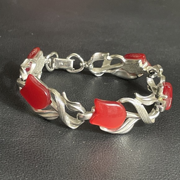 6-Piece Bundle: Vintage STAR silver-tone bracelet with red Thermoset tulips; dainty 14K gold plated ring with a Marquise cut green Vaseline glass crystal surrounded by faux pearls; gorgeous 14K gold overlay Krementz circle brooch with exquisite little opal; lovely JJ gold-tone and enamel hummingbird brooch; amazing Liz Claiborne gold-tone floral broochbeith faux green rhinestones; and a vintage gold-tone Victorian Revival style filigree brooch with a faux purple gemstone in the center surrounded by White rhinestones.