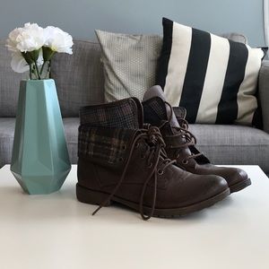 Cute combat boots with plaid detailing.