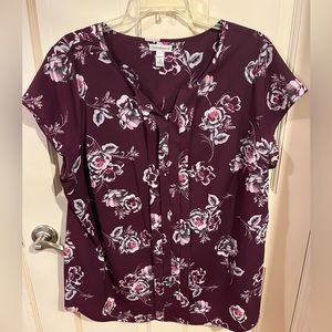 Purple floral, V-neck, cap sleeve blouse, pleated down the front.