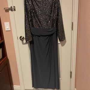 Flattering, comfortable Mother-of-the-Bride/Groom column gown in gray.