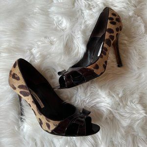 BRIAN ATWOOD Leopard Print Pony Hair with Leather Bow Peep Toe Heels Size 38