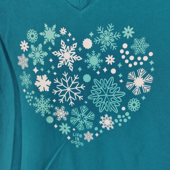 Love this gorgeous turquoise tee with white snowflake heart! Great for now over long sleeve tee & on its own next Christmas at the beach! I am very pleased with my purchase!