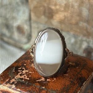Antique 18ct and Plat Rose-Cut Diamond Halo + Opal Ring