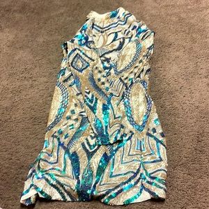 Sequence Royal blue pink yellow mid knee dress with open front under breast.