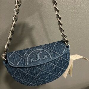 Authentic Tory Burch The Mini Fleming Soft Denim Crescent Bag. Brand New.