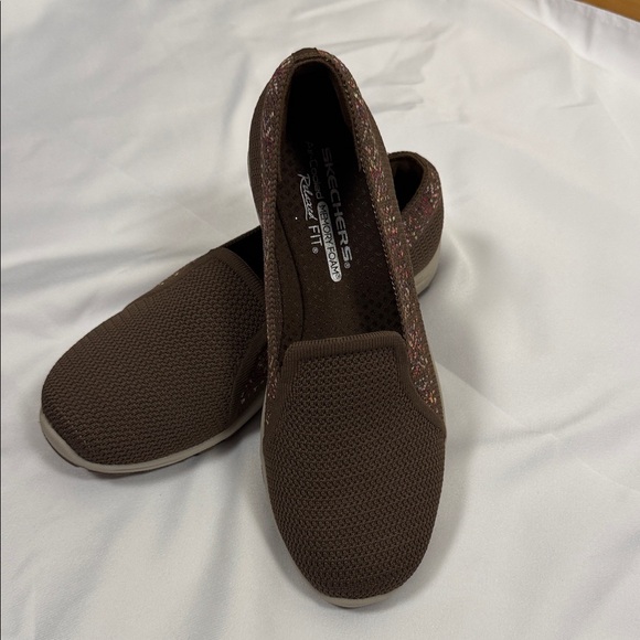 These Sketcher's shoes are a very nice chocolate color with a cute print trim. They are perfect and in new condition.