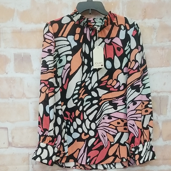 Love this blouse with vibrant colors; arrived quickly; well packaged