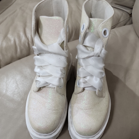 These boots are awesome! Love the subtle iridescent glitter. The satin laces are also a nice touch. I am missing a side zipper. I’ve purchased a number of pair of platforms that have that zipper. Sure makes it easy to get on and off. Not a complaint, I love the boots!!