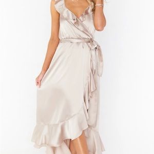 Show Me Your MuMu Samantha Ruffle Wrap Dress in Champagne Satin - Size 4