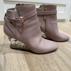 Tan booties with detailed heel and zippered side